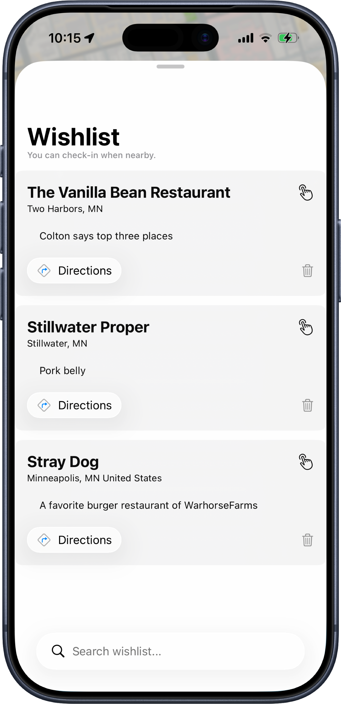 Check in at places you've been. Wish lists for places you want to go. Coming from Swarm? Import your Foursquare/Swarm Check-ins from the Settings menu.