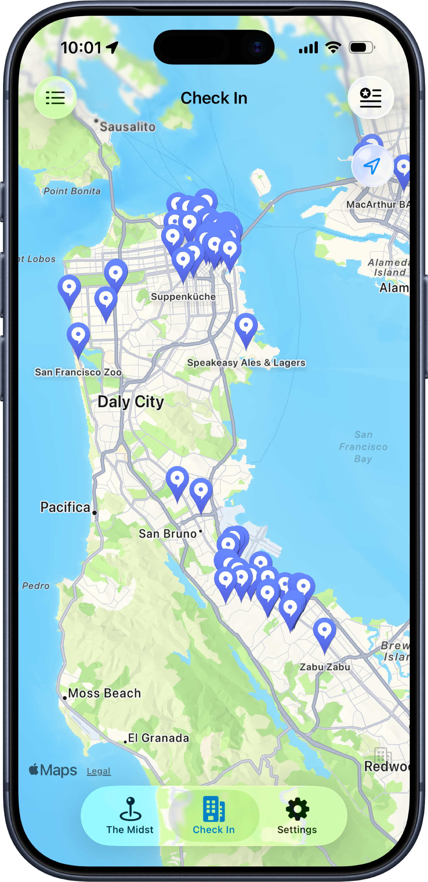 Check-in by tapping a place on the map. Check-ins also post publicly to The Midst Not feeling social? With a simple toggle choose only to save check-ins to your Saved Places list. Places are saved only on your device.