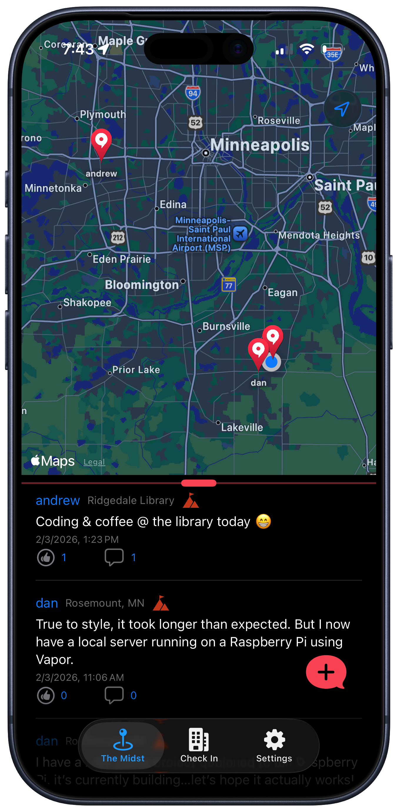 The Midst is a location-based social network and life logging app. Posting to The Midst drops a pin at your current location and is visible to anyone in the world.